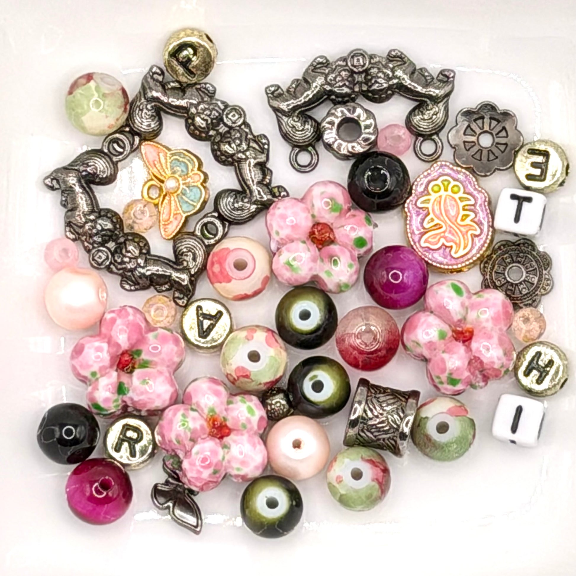 Inside star container holds 6oz of: pink flower shaped beads 2 tassels a mix of seed beads, glossy round glass beads letter beads for personalization black connectors and spacers
