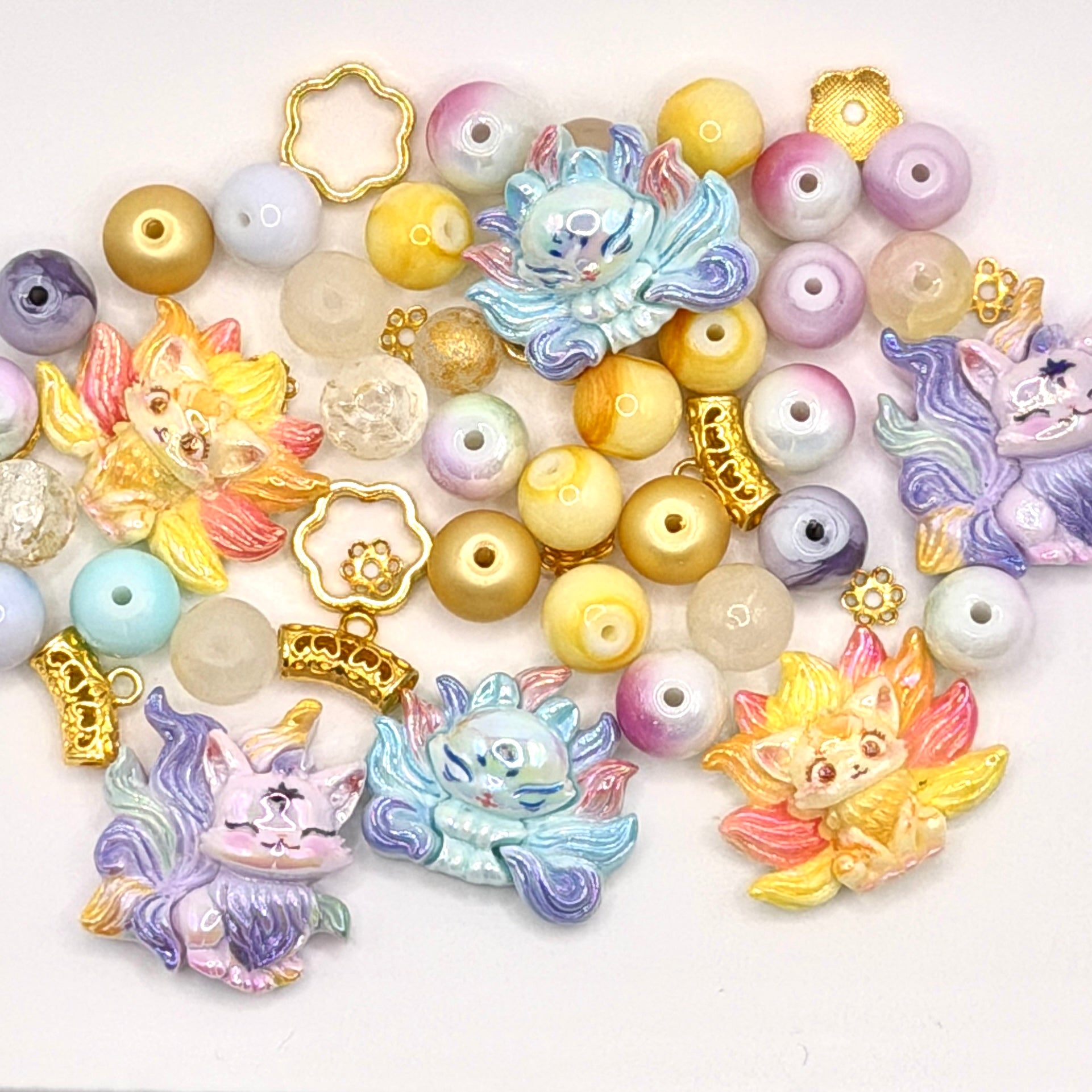 A RMCBeads special mix of porcelain and glass pastel colored beads with gold jewelry findings and 9 tail fox charms